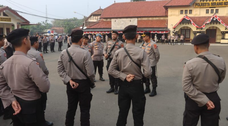 Kapolresta Serkot Kombes Pol. Sofwan Hermanto, S.I.K., M.H., M.I.K., bersama Wakapolresta Serkot dan Pejabat utama Polresta Serkot melakukan pengecekan kehadiran dan kesiap siagaan Personel Polresta Serkot pada saat apel satker di halaman Mapolresta Serkot.